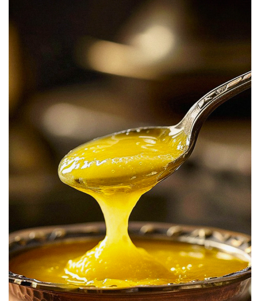 Diese geklärte Butter wird vollständig natürlich hergestellt – durch ein langsames, schonendes Erhitzen über Stunden oder sogar Tage. Dabei werden Unreinheiten wie Laktose, Casein und Wasser entfernt, sodass ein reines, gesundes Fett ohne Zusatzstoffe oder Konservierungsmittel entsteht. Das Ergebnis ist eine goldene Butter mit süßem Duft und karamellisiert-mandeligem Geschmack.